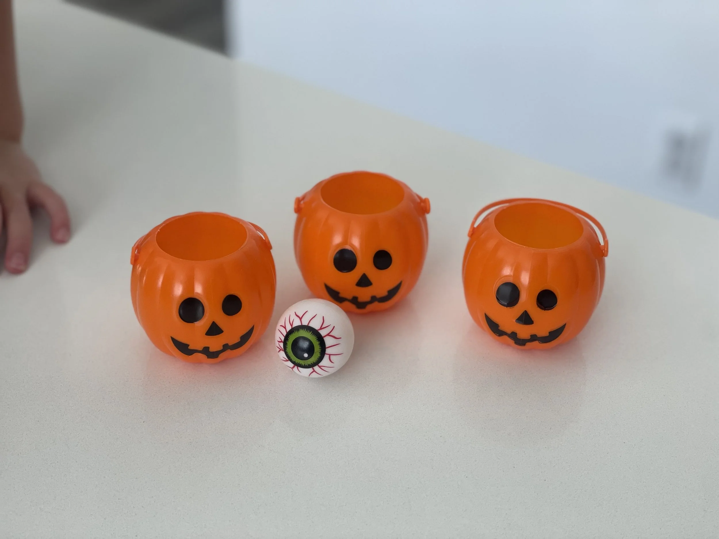 Supplies Needed: Plastic Pumpkins, Eyeball Ping Pongs