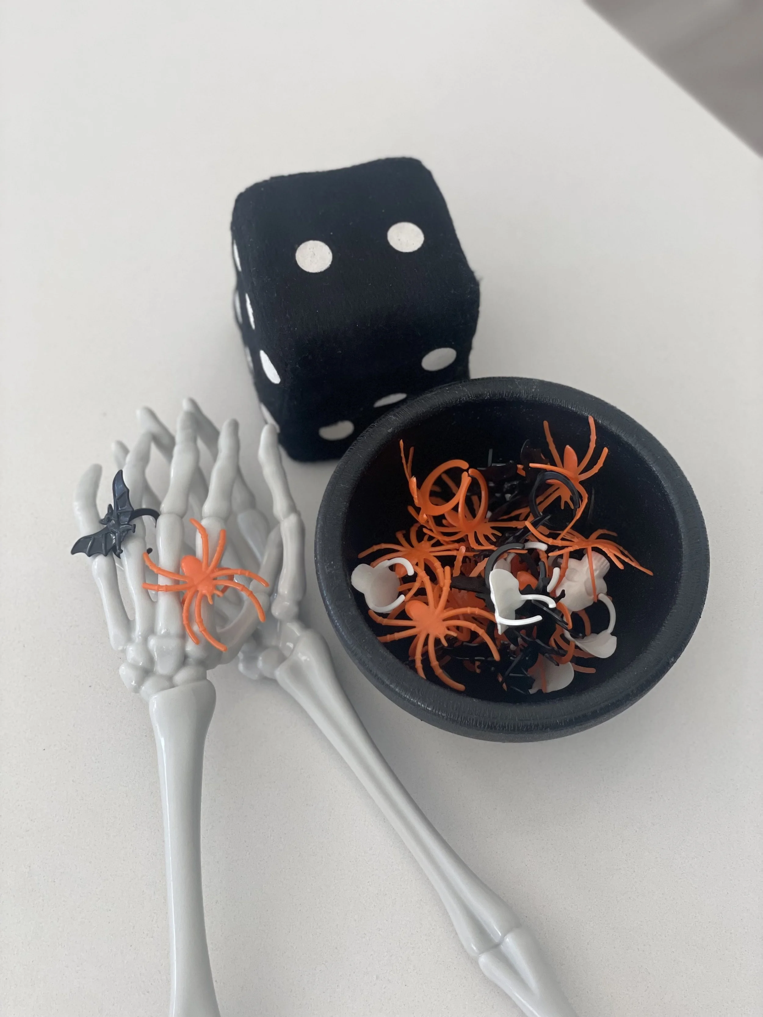 Supplies Needed: Halloween Rings, Dice, Plastic Skeleton Hands
