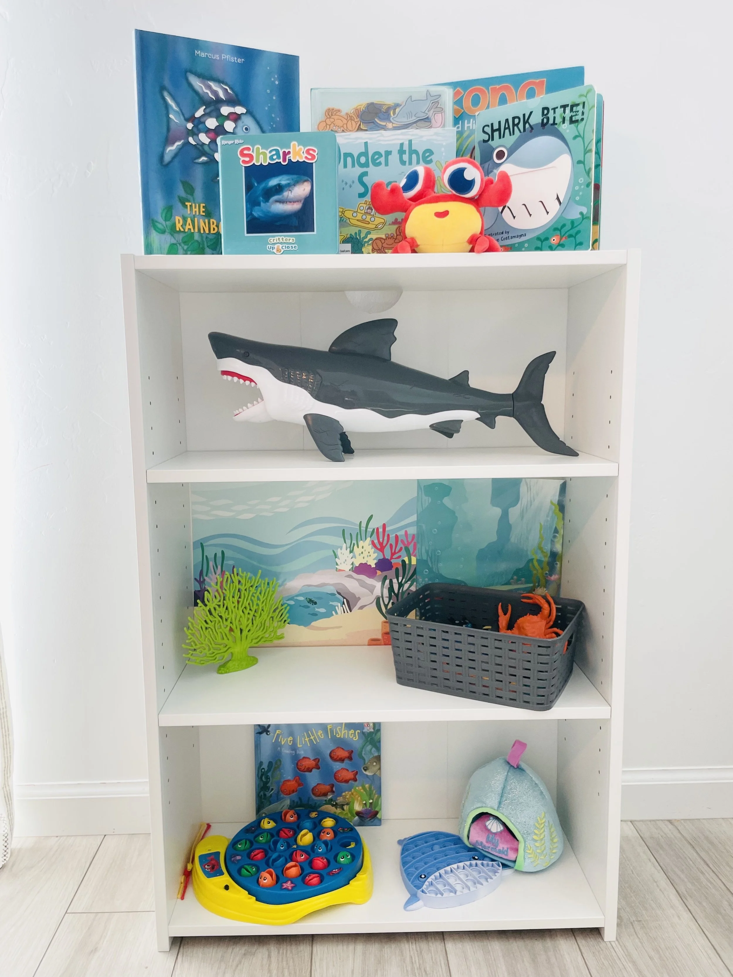 Sooo to kick off shark week, try gathering any and all ocean themed toys and set them up in a new room. Maybe for this week only, you get to have these special shark toys in your kitchen or living room, or a place that toys aren’t typically allowed. It makes for a fun “novelty” effect and it’s an easy way to signal to your children that we’re celebrating or that this week is “special”.